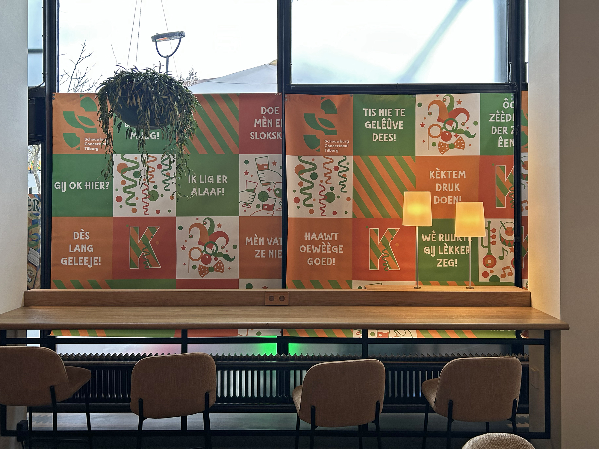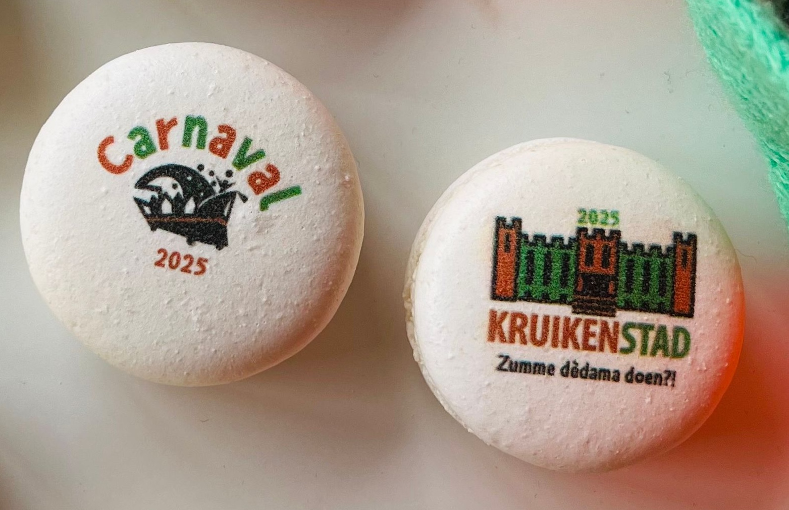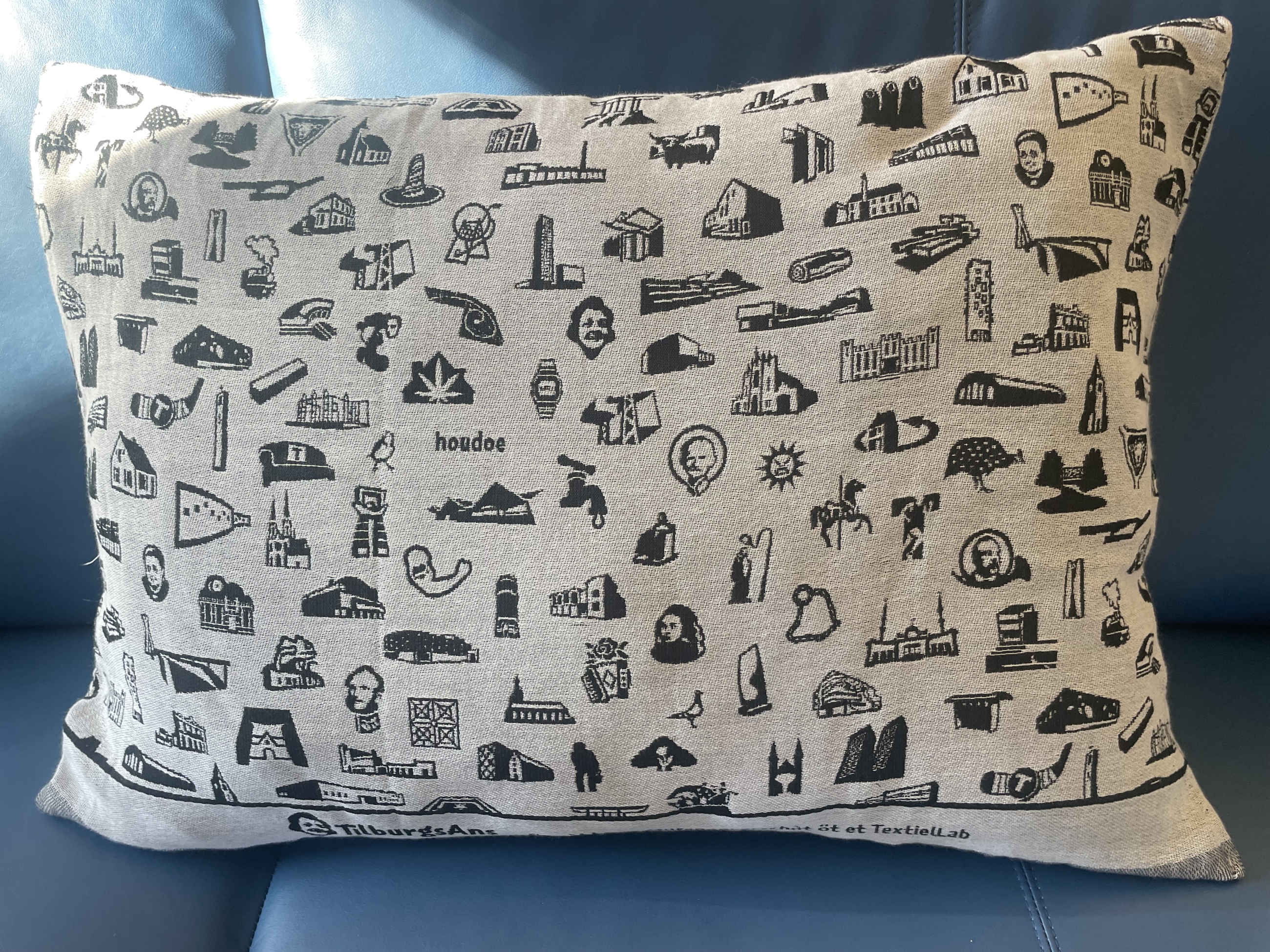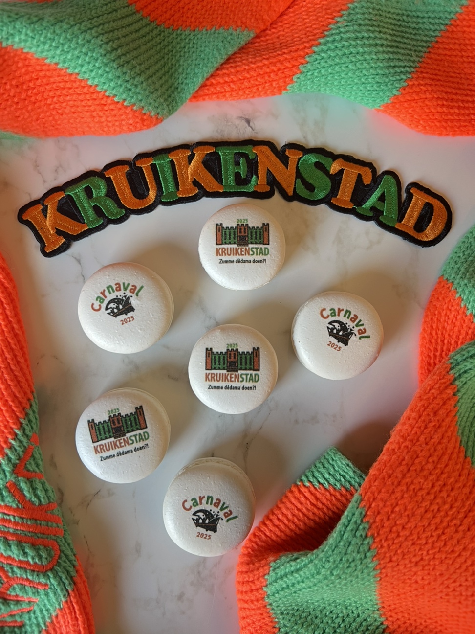 The TextielMuseum uses the icons of TilburgsAns in woven tissues. These tissues are sold in the TextielShop since february. In a week and a half they were sold out. A nice cushion was one of the products made with this fabric. Surprising were also the tiles with icons that were made for the bar Ome Ollie. And what to think of the macaroons by Cake 5 made for the carnival days on which the palace and the opstoet were printed, the sneakers with the kruikenzeiker, the carnival posters typeset in TilburgsAns, the tattoo of the section sign, and the website of Wijkkrant Tilburg. Icons as well as type of TilburgsAns was used for the Dialog Tree and the coffee mugs of the Interreligious Dialog Tilburg.