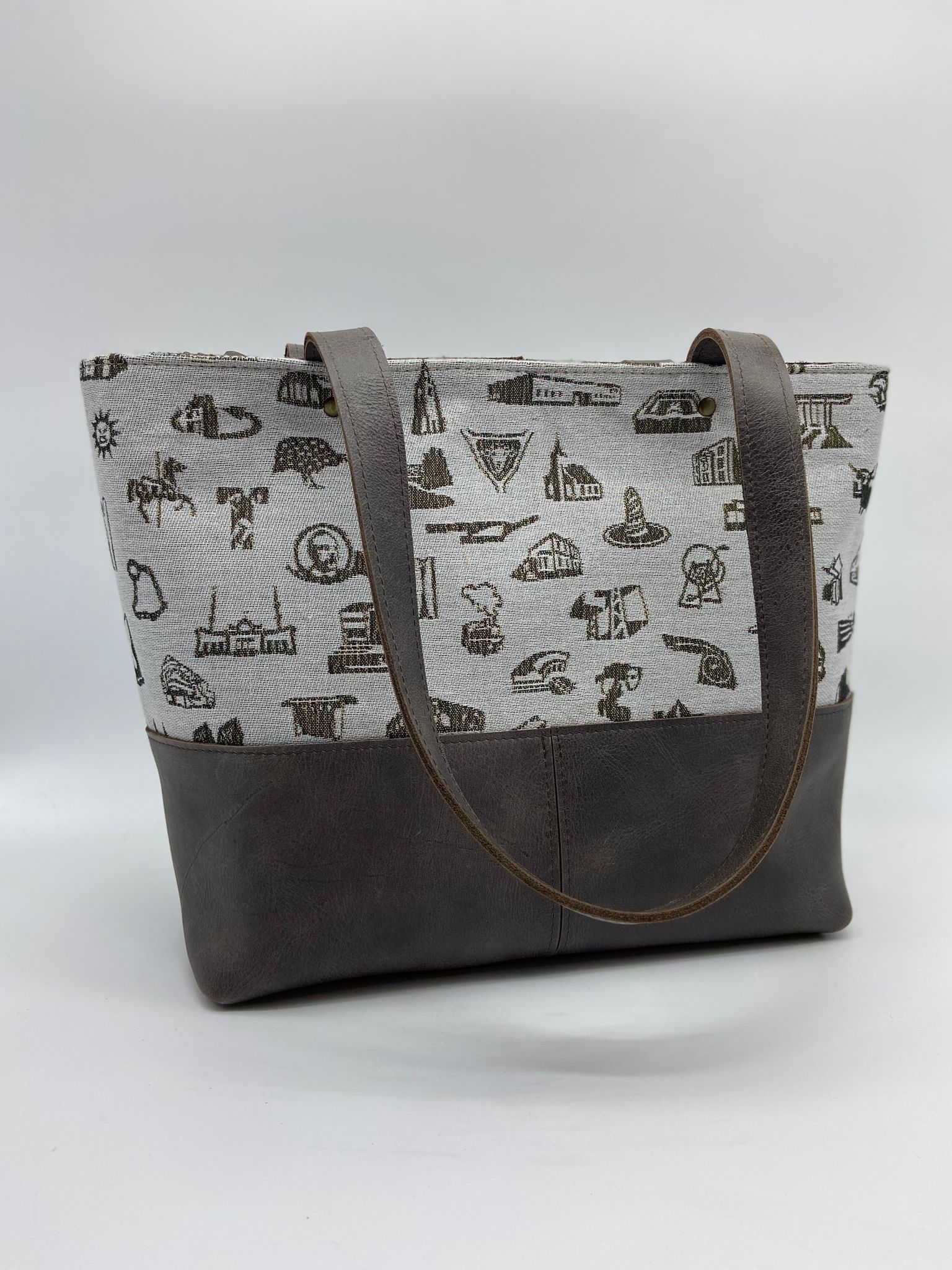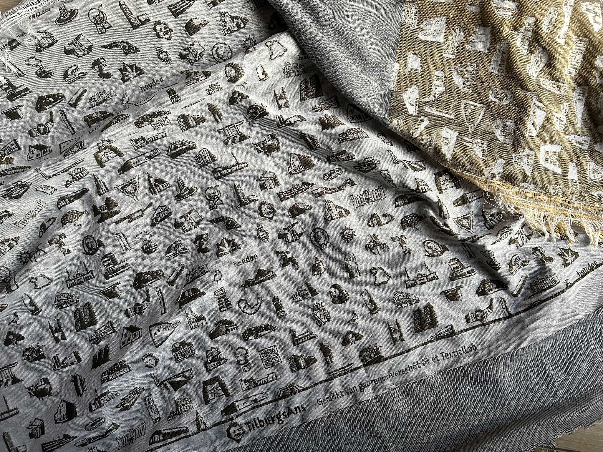 The new year started with some beautiful applications of TilburgsAns. We received a nice guide with coffee walks, typeset in this typeface, an announcement of a Werkstatt concert in Neukirchen, Germany, and of the Taalrondje, a tattoo of the section sign and – last but not least – a handbag made with woven fabric of the TextielMuseum Tilburg in which TilburgsAns’s icons are pictured.